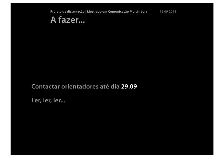 18. 18. Projeto de dissertação | Mestrado em Comunicação Multimédia 16 09 2011 A fazer...Contactar orientadores até dia 29.09Ler, ler, ler...