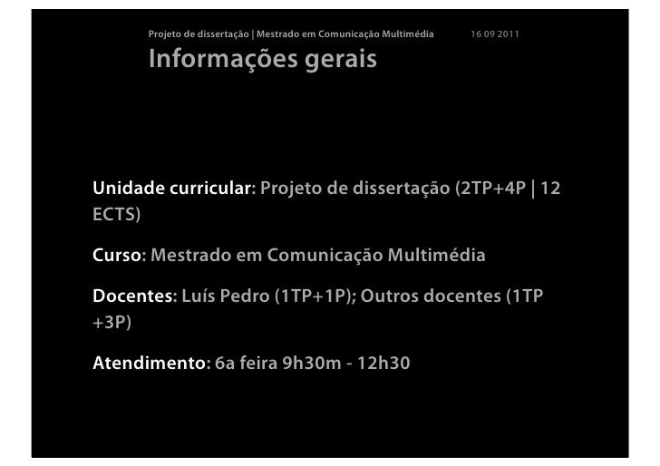 2. 2. Projeto de dissertação | Mestrado em Comunicação Multimédia 16 09 2011 Informações geraisUnidade curricular: Projeto de dissertação (2TP+4P | 12ECTS)Curso: Mestrado em Comunicação MultimédiaDocentes: Luís Pedro (1TP+1P); Outros docentes (1TP+3P)Atendimento: 6a feira 9h30m - 12h30