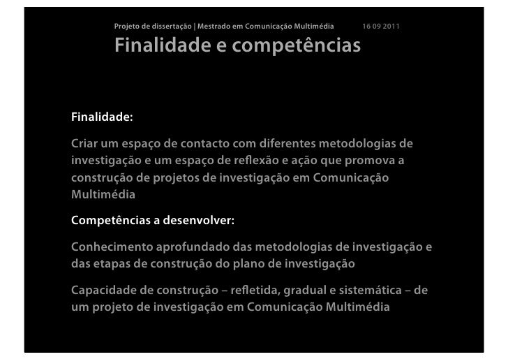 3. 3. Projeto de dissertação | Mestrado em Comunicação Multimédia 16 09 2011 Finalidade e competênciasFinalidade:Criar um espaço de contacto com diferentes metodologias deinvestigação e um espaço de reflexão e ação que promova aconstrução de projetos de investigação em ComunicaçãoMultimédiaCompetências a desenvolver:Conhecimento aprofundado das metodologias de investigação edas etapas de construção do plano de investigaçãoCapacidade de construção – refletida, gradual e sistemática – deum projeto de investigação em Comunicação Multimédia