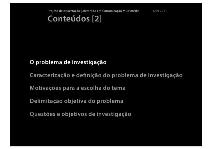5. 5. Projeto de dissertação | Mestrado em Comunicação Multimédia 16 09 2011 Conteúdos [2]O problema de investigaçãoCaracterização e definição do problema de investigaçãoMotivações para a escolha do temaDelimitação objetiva do problemaQuestões e objetivos de investigação