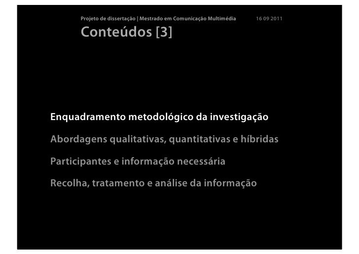 6. 6. Projeto de dissertação | Mestrado em Comunicação Multimédia 16 09 2011 Conteúdos [3]Enquadramento metodológico da investigaçãoAbordagens qualitativas, quantitativas e híbridasParticipantes e informação necessáriaRecolha, tratamento e análise da informação