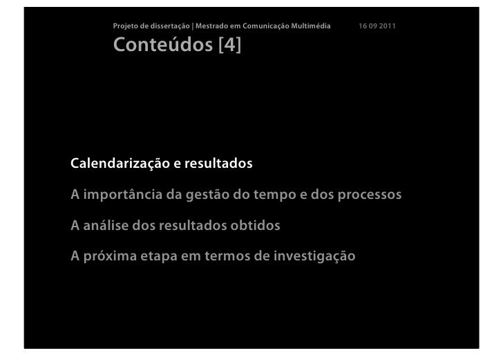 7. 7. Projeto de dissertação | Mestrado em Comunicação Multimédia 16 09 2011 Conteúdos [4]Calendarização e resultadosA importância da gestão do tempo e dos processosA análise dos resultados obtidosA próxima etapa em termos de investigação