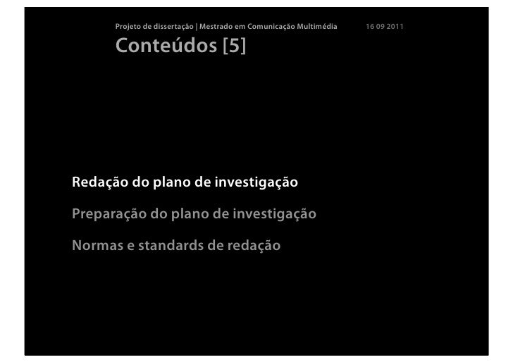8. 8. Projeto de dissertação | Mestrado em Comunicação Multimédia 16 09 2011 Conteúdos [5]Redação do plano de investigaçãoPreparação do plano de investigaçãoNormas e standards de redação