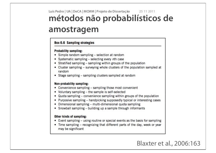 11. 11. Luís Pedro | UA | DeCA | MCMM | Projeto de Dissertação 25 11 2011métodos não probabilísticos deamostragem Blaxter et al., 2006:163