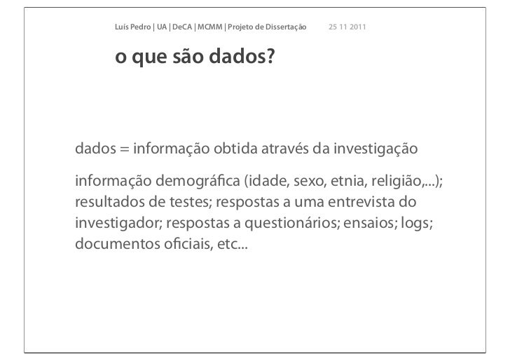 12. 12. Luís Pedro | UA | DeCA | MCMM | Projeto de Dissertação 25 11 2011 o que são dados?dados = informação obtida através da investigaçãoinformação demográfica (idade, sexo, etnia, religião,...);resultados de testes; respostas a uma entrevista doinvestigador; respostas a questionários; ensaios; logs;documentos oficiais, etc...