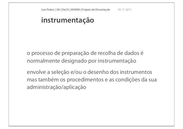 14. 14. Luís Pedro | UA | DeCA | MCMM | Projeto de Dissertação 25 11 2011 instrumentaçãoo processo de preparação de recolha de dados énormalmente designado por instrumentaçãoenvolve a seleção e/ou o desenho dos instrumentosmas também os procedimentos e as condições da suaadministração/aplicação