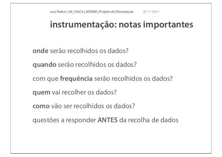 15. 15. Luís Pedro | UA | DeCA | MCMM | Projeto de Dissertação 25 11 2011 instrumentação: notas importantesonde serão recolhidos os dados?quando serão recolhidos os dados?com que frequência serão recolhidos os dados?quem vai recolher os dados?como vão ser recolhidos os dados?questões a responder ANTES da recolha de dados