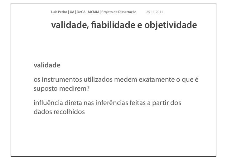 16. 16. Luís Pedro | UA | DeCA | MCMM | Projeto de Dissertação 25 11 2011 validade, fiabilidade e objetividadevalidadeos instrumentos utilizados medem exatamente o que ésuposto medirem?influência direta nas inferências feitas a partir dosdados recolhidos