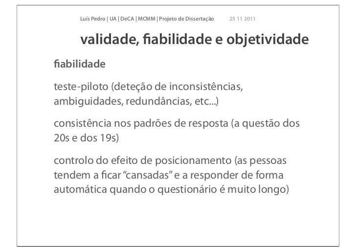 17. 17. Luís Pedro | UA | DeCA | MCMM | Projeto de Dissertação 25 11 2011 validade, fiabilidade e objetividadefiabilidadeteste-piloto (deteção de inconsistências,ambiguidades, redundâncias, etc...)consistência nos padrões de resposta (a questão dos20s e dos 19s)controlo do efeito de posicionamento (as pessoastendem a ficar “cansadas” e a responder de formaautomática quando o questionário é muito longo)