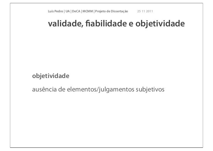 18. 18. Luís Pedro | UA | DeCA | MCMM | Projeto de Dissertação 25 11 2011 validade, fiabilidade e objetividadeobjetividadeausência de elementos/julgamentos subjetivos