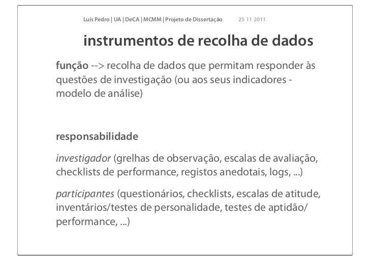 19. 19. Luís Pedro | UA | DeCA | MCMM | Projeto de Dissertação 25 11 2011 instrumentos de recolha de dadosfunção --> recolha de dados que permitam responder àsquestões de investigação (ou aos seus indicadores -modelo de análise)responsabilidadeinvestigador (grelhas de observação, escalas de avaliação,checklists de performance, registos anedotais, logs, ...)participantes (questionários, checklists, escalas de atitude,inventários/testes de personalidade, testes de aptidão/performance, ...)