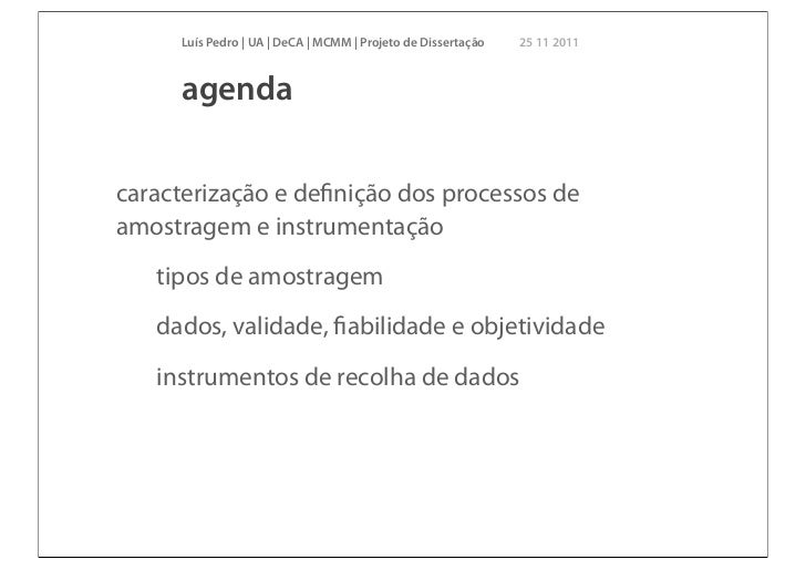 2. 2. Luís Pedro | UA | DeCA | MCMM | Projeto de Dissertação 25 11 2011 agendacaracterização e definição dos processos deamostragem e instrumentação tipos de amostragem dados, validade, fiabilidade e objetividade instrumentos de recolha de dados