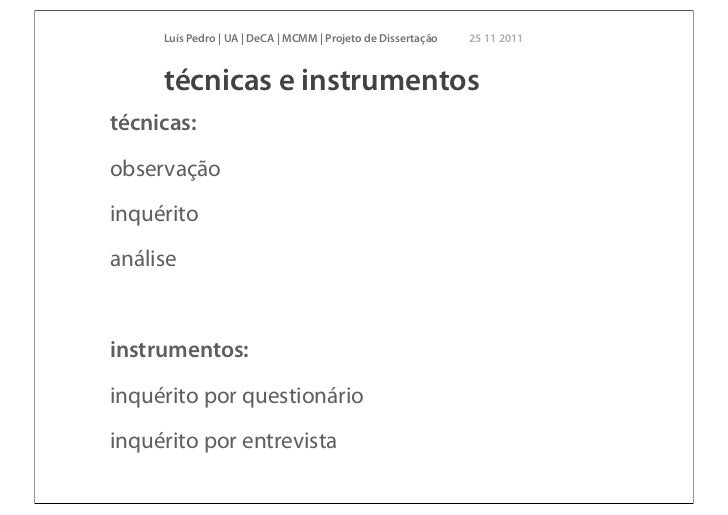 20. 20. Luís Pedro | UA | DeCA | MCMM | Projeto de Dissertação 25 11 2011 técnicas e instrumentostécnicas:observaçãoinquéritoanáliseinstrumentos:inquérito por questionárioinquérito por entrevista