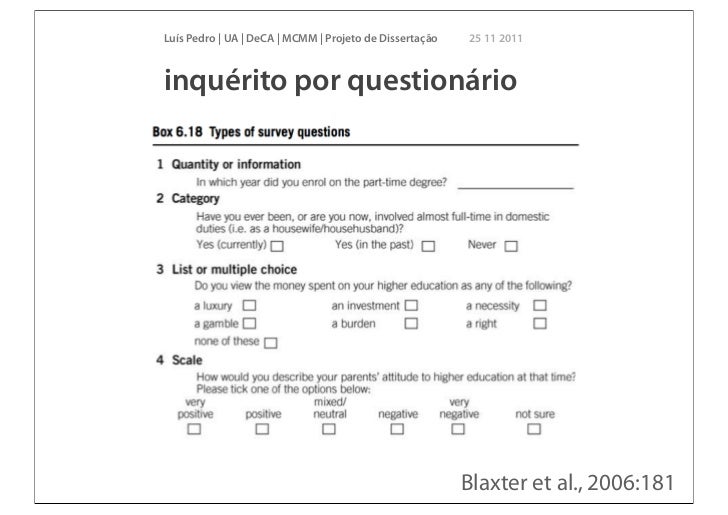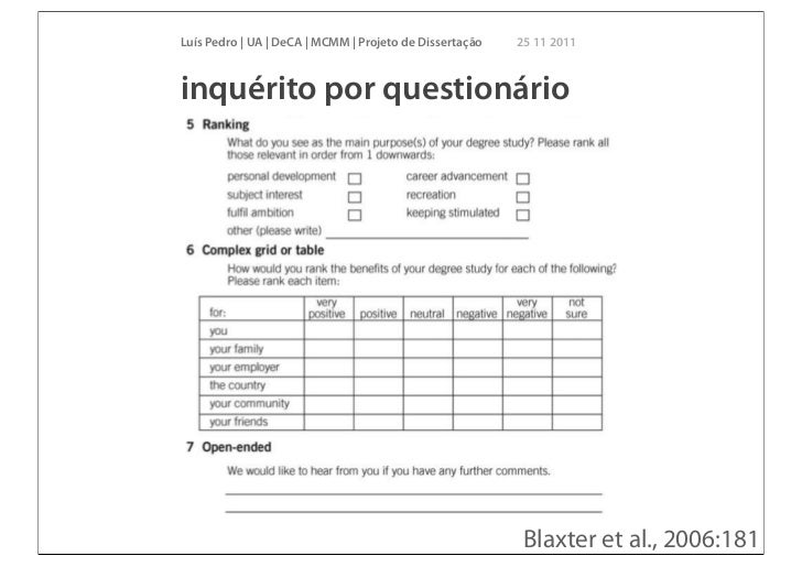 22. 22. Luís Pedro | UA | DeCA | MCMM | Projeto de Dissertação 25 11 2011inquérito por questionário Blaxter et al., 2006:181
