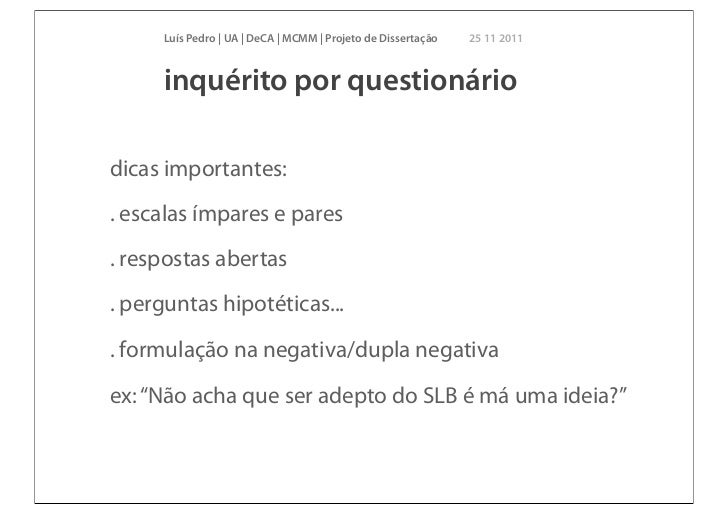 24. 24. Luís Pedro | UA | DeCA | MCMM | Projeto de Dissertação 25 11 2011 inquérito por questionáriodicas importantes:. escalas ímpares e pares. respostas abertas. perguntas hipotéticas.... formulação na negativa/dupla negativaex: “Não acha que ser adepto do SLB é má uma ideia?”