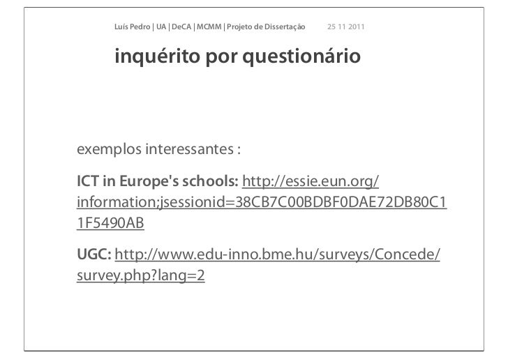 25. 25. Luís Pedro | UA | DeCA | MCMM | Projeto de Dissertação 25 11 2011 inquérito por questionárioexemplos interessantes :ICT in Europes schools: http://essie.eun.org/information;jsessionid=38CB7C00BDBF0DAE72DB80C11F5490ABUGC: http://www.edu-inno.bme.hu/surveys/Concede/survey.php?lang=2