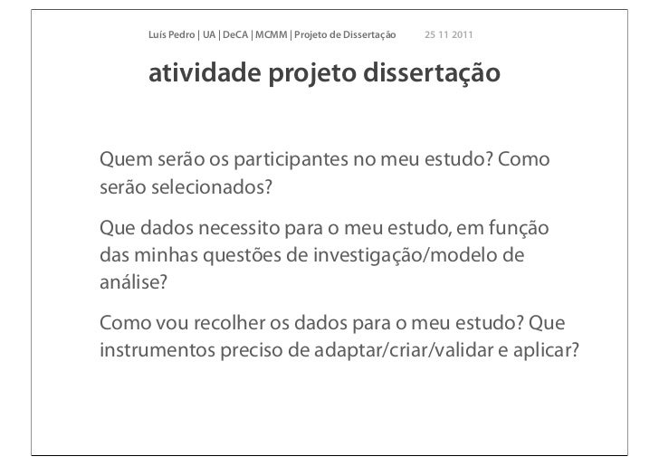 28. 28. Luís Pedro | UA | DeCA | MCMM | Projeto de Dissertação 25 11 2011 atividade projeto dissertaçãoQuem serão os participantes no meu estudo? Comoserão selecionados?Que dados necessito para o meu estudo, em funçãodas minhas questões de investigação/modelo deanálise?Como vou recolher os dados para o meu estudo? Queinstrumentos preciso de adaptar/criar/validar e aplicar?