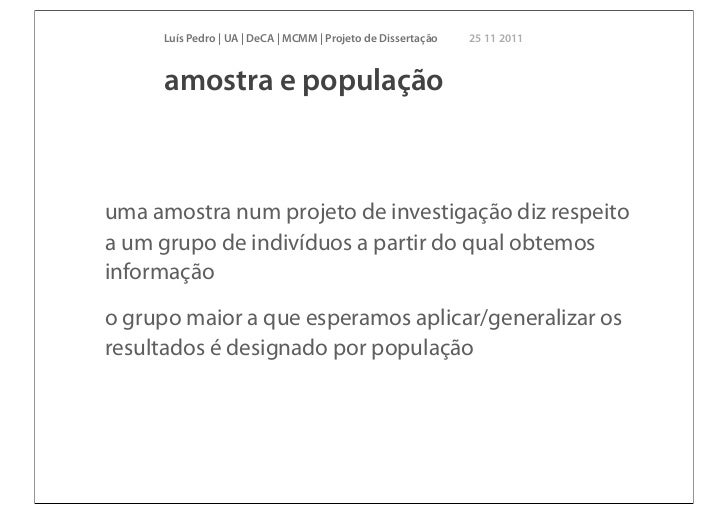 4. 4. Luís Pedro | UA | DeCA | MCMM | Projeto de Dissertação 25 11 2011 amostra e populaçãouma amostra num projeto de investigação diz respeitoa um grupo de indivíduos a partir do qual obtemosinformaçãoo grupo maior a que esperamos aplicar/generalizar osresultados é designado por população