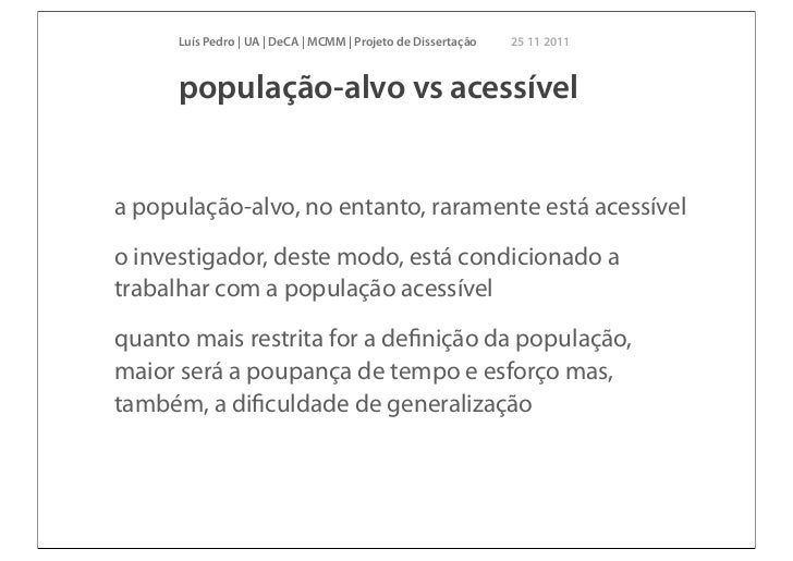 5. 5. Luís Pedro | UA | DeCA | MCMM | Projeto de Dissertação 25 11 2011 população-alvo vs acessívela população-alvo, no entanto, raramente está acessívelo investigador, deste modo, está condicionado atrabalhar com a população acessívelquanto mais restrita for a definição da população,maior será a poupança de tempo e esforço mas,também, a dificuldade de generalização