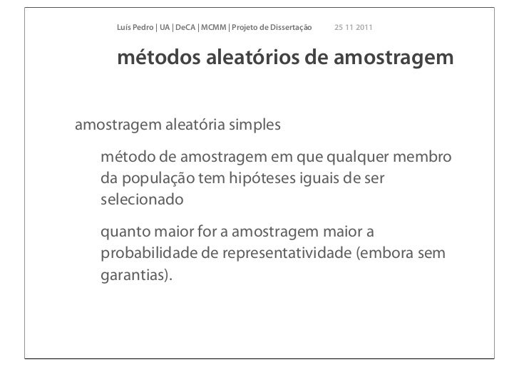 6. 6. Luís Pedro | UA | DeCA | MCMM | Projeto de Dissertação 25 11 2011 métodos aleatórios de amostragemamostragem aleatória simples método de amostragem em que qualquer membro da população tem hipóteses iguais de ser selecionado quanto maior for a amostragem maior a probabilidade de representatividade (embora sem garantias).