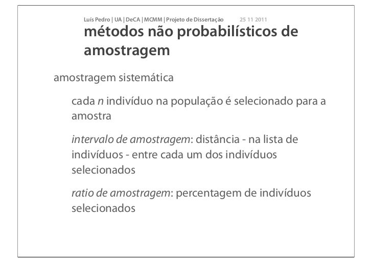 8. 8. Luís Pedro | UA | DeCA | MCMM | Projeto de Dissertação 25 11 2011 métodos não probabilísticos de amostragemamostragem sistemática cada n indivíduo na população é selecionado para a amostra intervalo de amostragem: distância - na lista de indivíduos - entre cada um dos indivíduos selecionados ratio de amostragem: percentagem de indivíduos selecionados