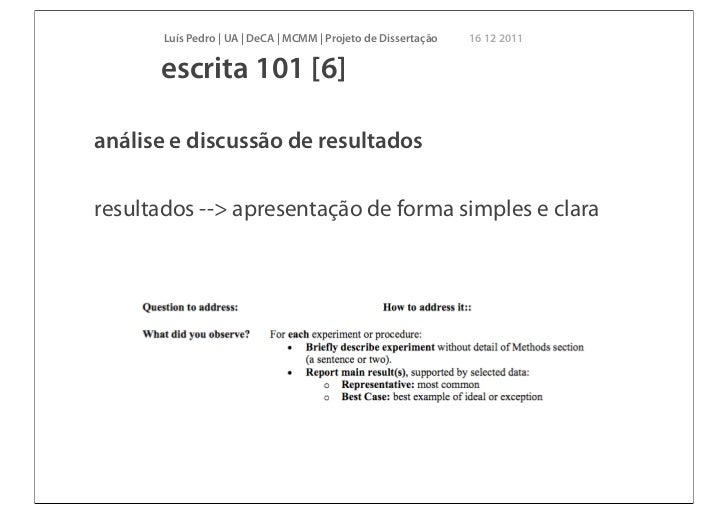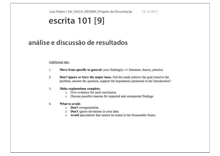 9. 9. Luís Pedro | UA | DeCA | MCMM | Projeto de Dissertação 16 12 2011 escrita 101 [6]análise e discussão de resultadosresultados --> apresentação de forma simples e clara