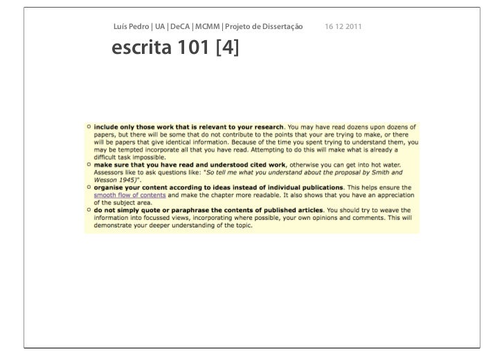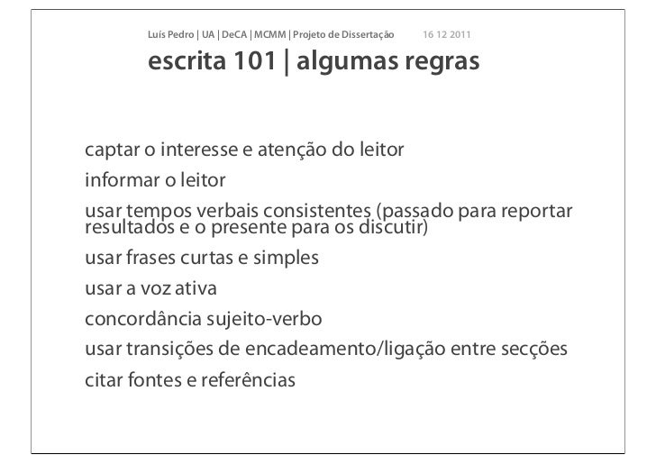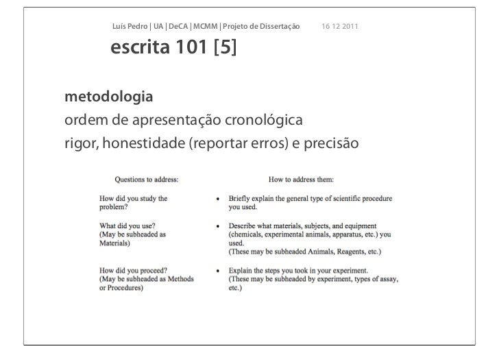 8. 8. Luís Pedro | UA | DeCA | MCMM | Projeto de Dissertação 16 12 2011 escrita 101 [5]metodologiaordem de apresentação cronológicarigor, honestidade (reportar erros) e precisão