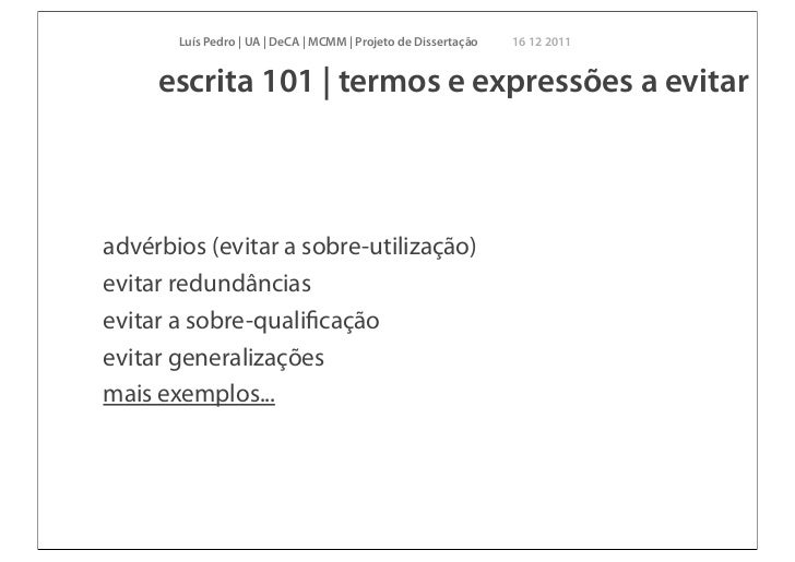 14. 14. Luís Pedro | UA | DeCA | MCMM | Projeto de Dissertação 16 12 2011 escrita 101 | termos e expressões a evitaradvérbios (evitar a sobre-utilização)evitar redundânciasevitar a sobre-qualificaçãoevitar generalizaçõesmais exemplos...