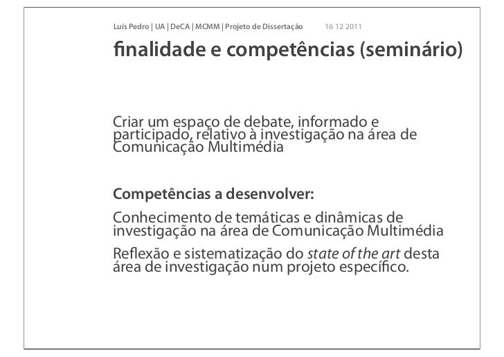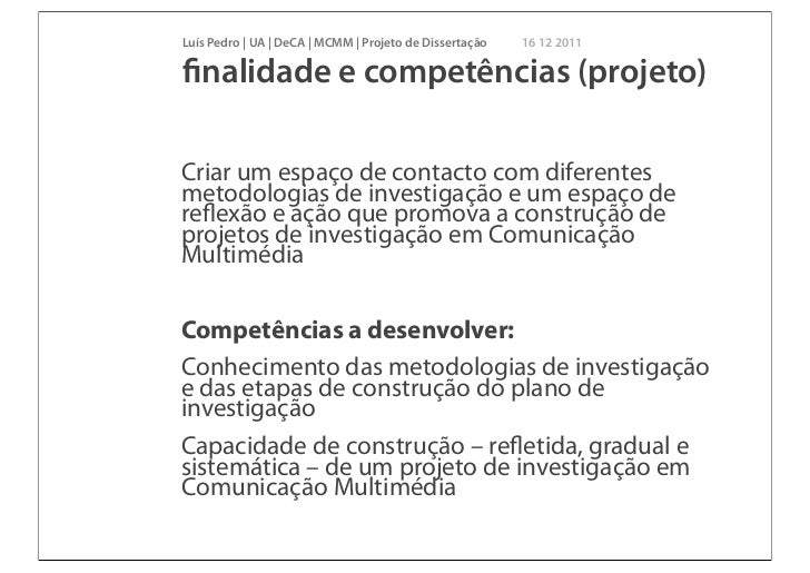 16. 16. Luís Pedro | UA | DeCA | MCMM | Projeto de Dissertação 16 12 2011finalidade e competências (projeto)Criar um espaço de contacto com diferentesmetodologias de investigação e um espaço dereflexão e ação que promova a construção deprojetos de investigação em ComunicaçãoMultimédiaCompetências a desenvolver:Conhecimento das metodologias de investigaçãoe das etapas de construção do plano deinvestigaçãoCapacidade de construção – refletida, gradual esistemática – de um projeto de investigação emComunicação Multimédia