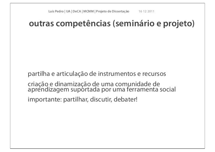 17. 17. Luís Pedro | UA | DeCA | MCMM | Projeto de Dissertação 16 12 2011outras competências (seminário e projeto)partilha e articulação de instrumentos e recursoscriação e dinamização de uma comunidade deaprendizagem suportada por uma ferramenta socialimportante: partilhar, discutir, debater!