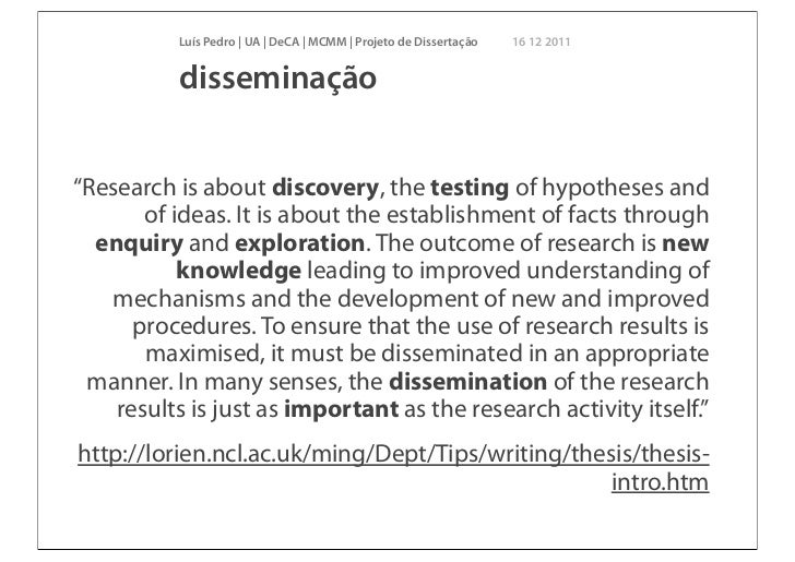 2. 2. Luís Pedro | UA | DeCA | MCMM | Projeto de Dissertação 16 12 2011 disseminação“Research is about discovery, the testing of hypotheses and of ideas. It is about the establishment of facts through enquiry and exploration. The outcome of research is new knowledge leading to improved understanding of mechanisms and the development of new and improved procedures. To ensure that the use of research results is maximised, it must be disseminated in an appropriate manner. In many senses, the dissemination of the research results is just as important as the research activity itself.”http://lorien.ncl.ac.uk/ming/Dept/Tips/writing/thesis/thesis- intro.htm