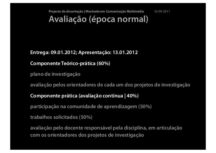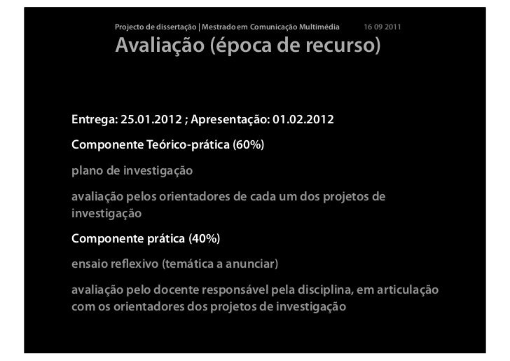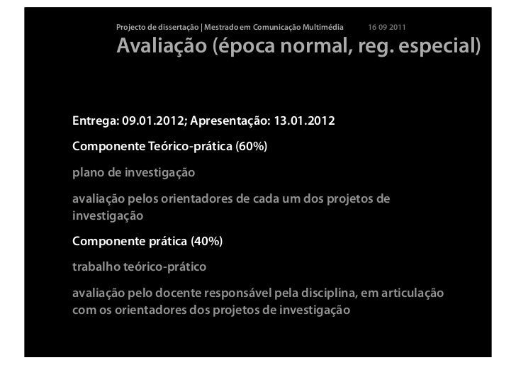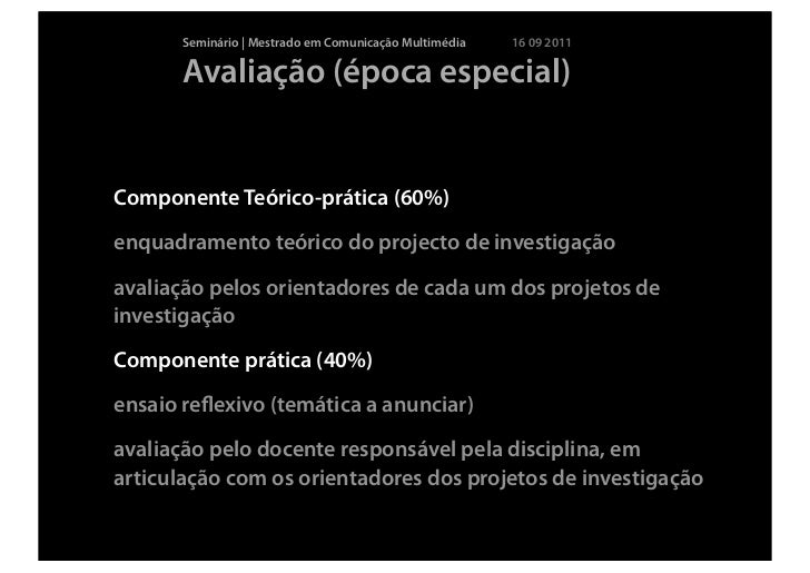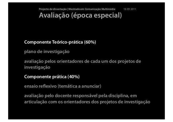 24. 24. Projecto de dissertação | Mestrado em Comunicação Multimédia 16 09 2011 Avaliação (época especial)Componente Teórico-prática (60%)plano de investigaçãoavaliação pelos orientadores de cada um dos projetos deinvestigaçãoComponente prática (40%)ensaio reflexivo (temática a anunciar)avaliação pelo docente responsável pela disciplina, emarticulação com os orientadores dos projetos de investigação