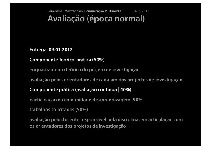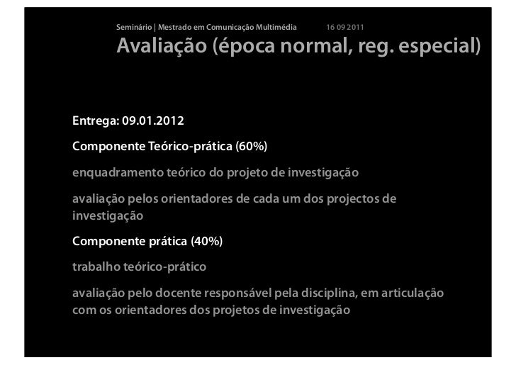 22. 22. Projecto de dissertação | Mestrado em Comunicação Multimédia 16 09 2011 Avaliação (época normal, reg. especial)Entrega: 09.01.2012; Apresentação: 13.01.2012Componente Teórico-prática (60%)plano de investigaçãoavaliação pelos orientadores de cada um dos projetos deinvestigaçãoComponente prática (40%)trabalho teórico-práticoavaliação pelo docente responsável pela disciplina, em articulaçãocom os orientadores dos projetos de investigação
