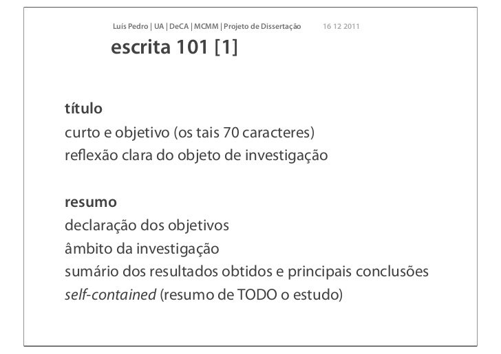 4. 4. Luís Pedro | UA | DeCA | MCMM | Projeto de Dissertação 16 12 2011 escrita 101 [1]títulocurto e objetivo (os tais 70 caracteres)reflexão clara do objeto de investigaçãoresumodeclaração dos objetivosâmbito da investigaçãosumário dos resultados obtidos e principais conclusõesself-contained (resumo de TODO o estudo)