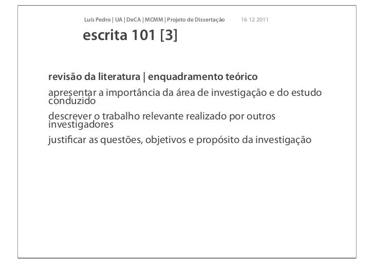 6. 6. Luís Pedro | UA | DeCA | MCMM | Projeto de Dissertação 16 12 2011 escrita 101 [3]revisão da literatura | enquadramento teóricoapresentar a importância da área de investigação e do estudoconduzidodescrever o trabalho relevante realizado por outrosinvestigadoresjustificar as questões, objetivos e propósito da investigação