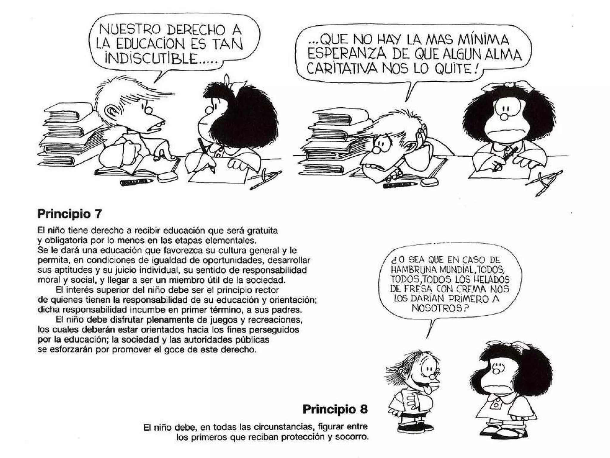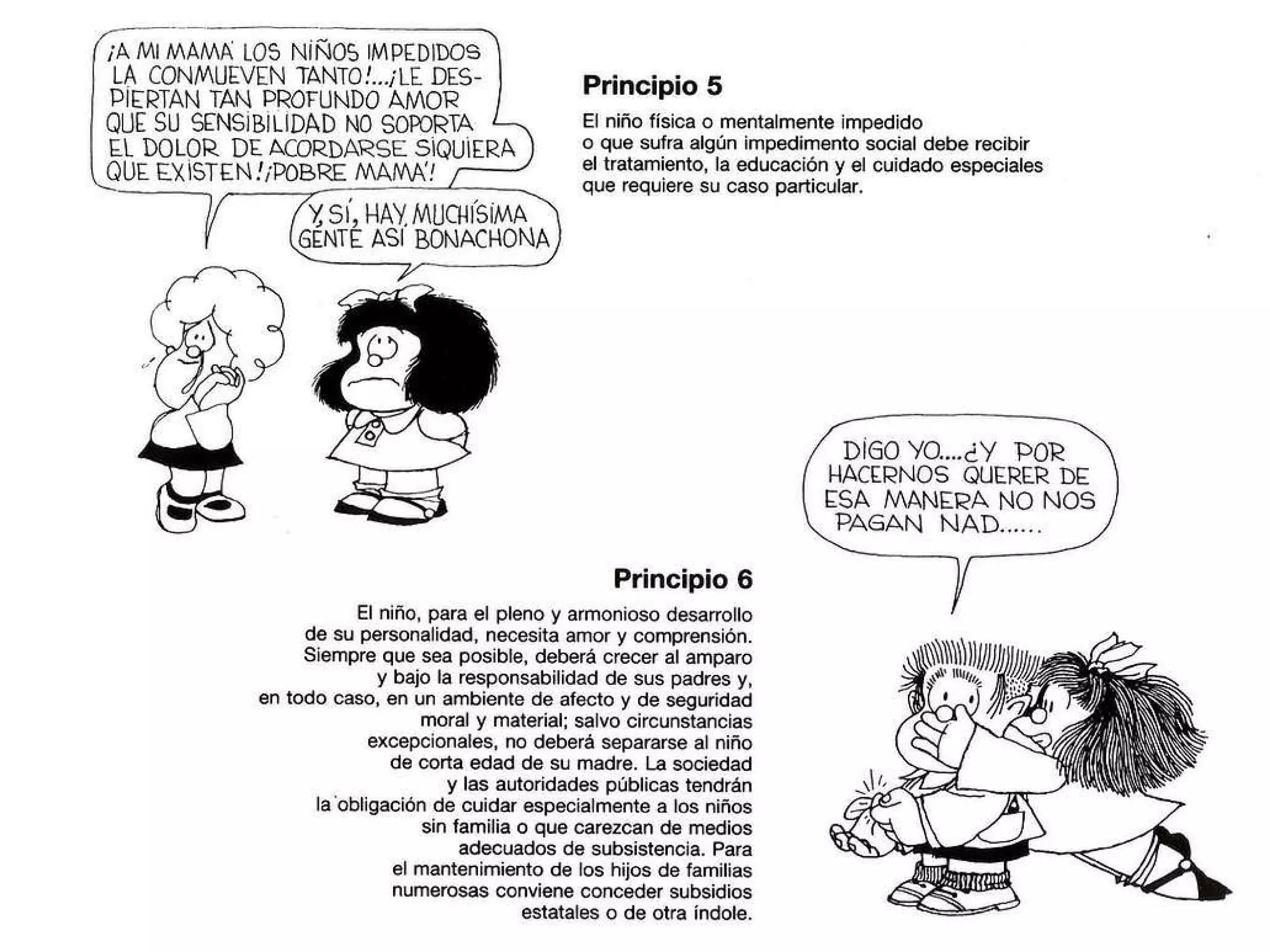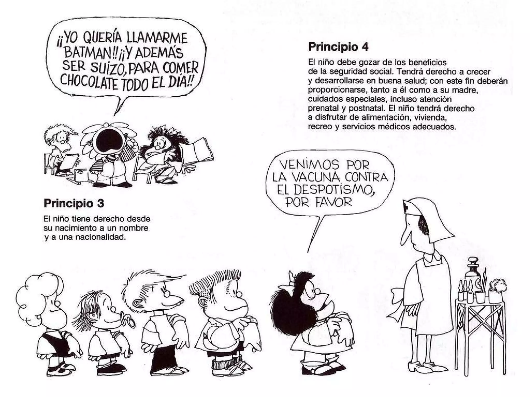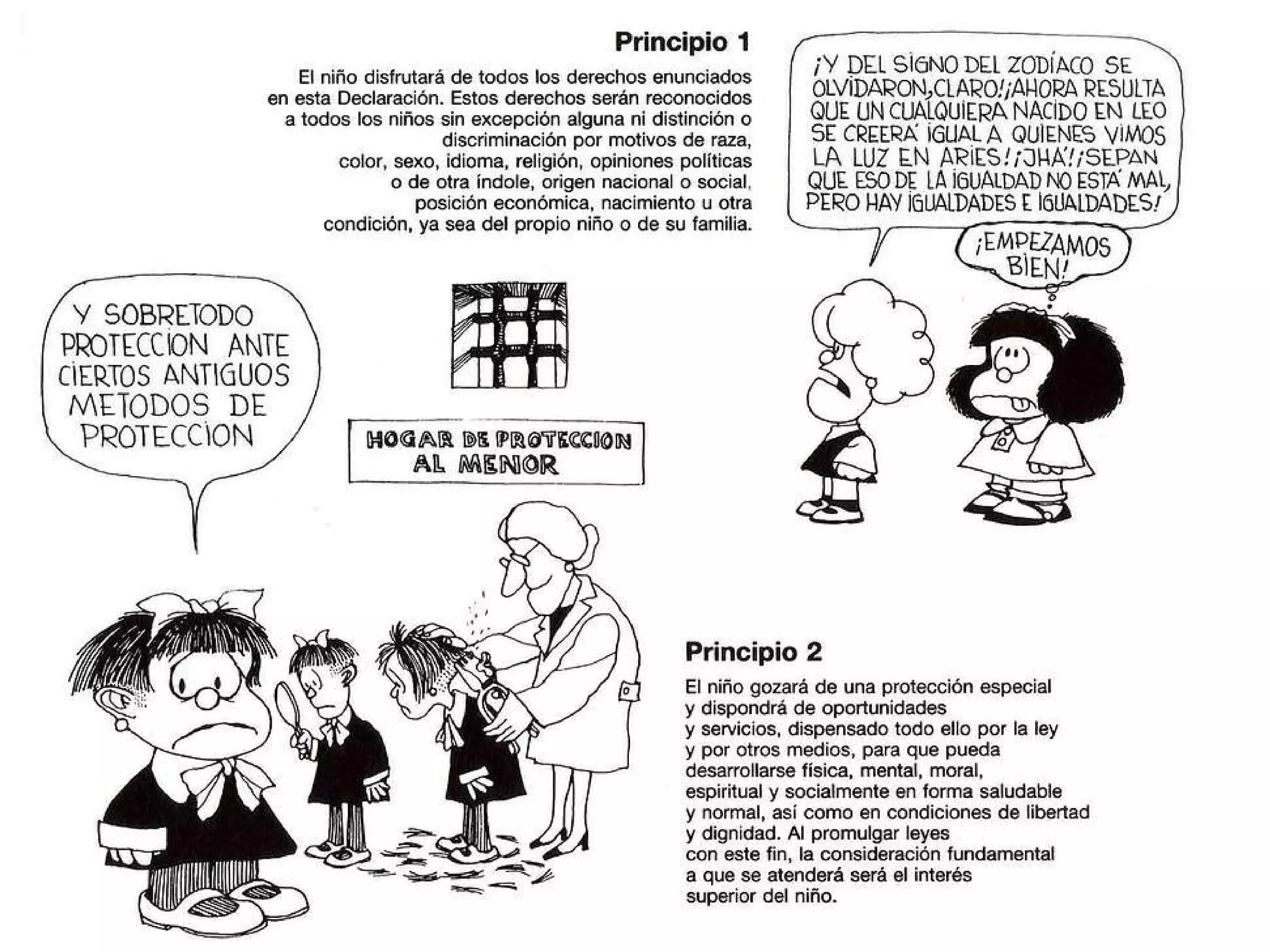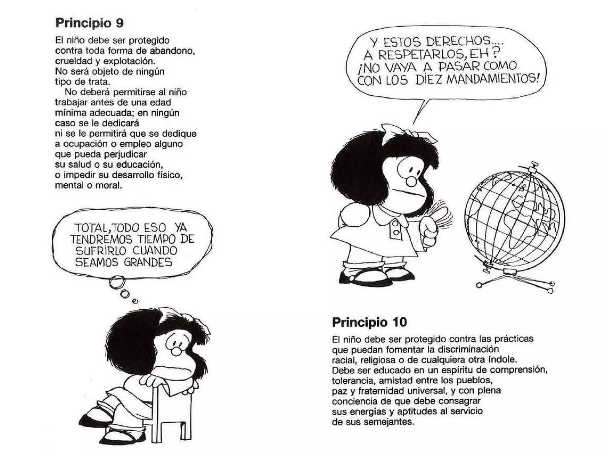 UNICEF le pidió a Quino en 1976 que ilustrara los 10 principios de la Declaración de los Derechos del Niño en un afiche. Aunque se han logrado avances, Quino sintió que todavía quedaba mucho trabajo por hacer para proteger plenamente los derechos de los niños.