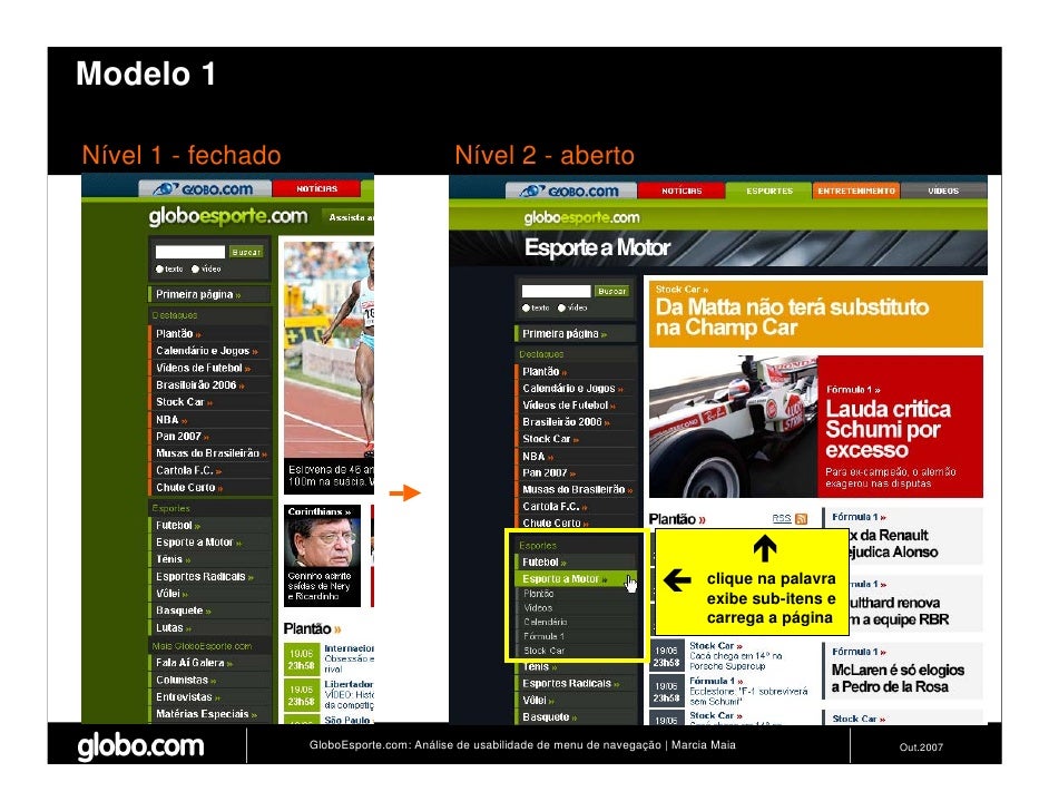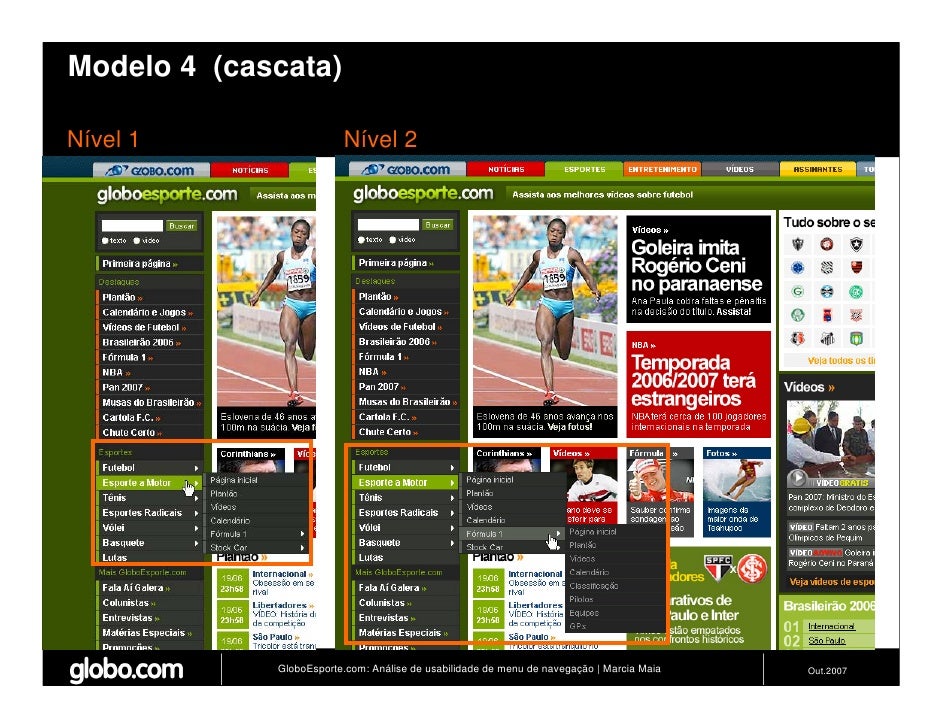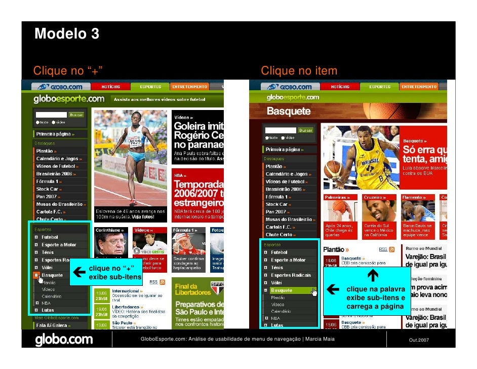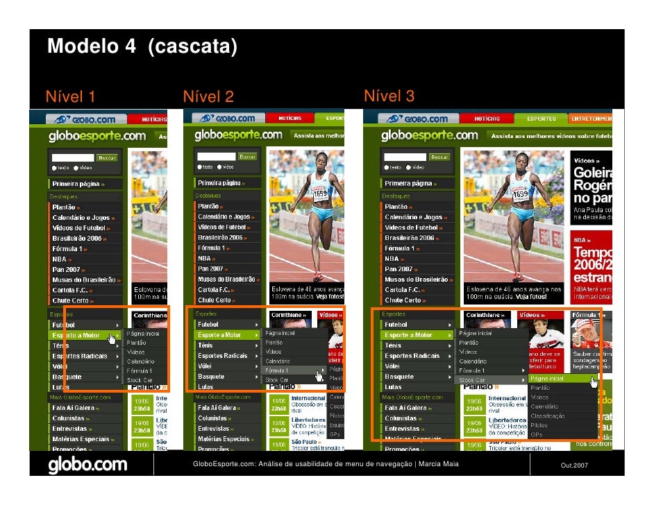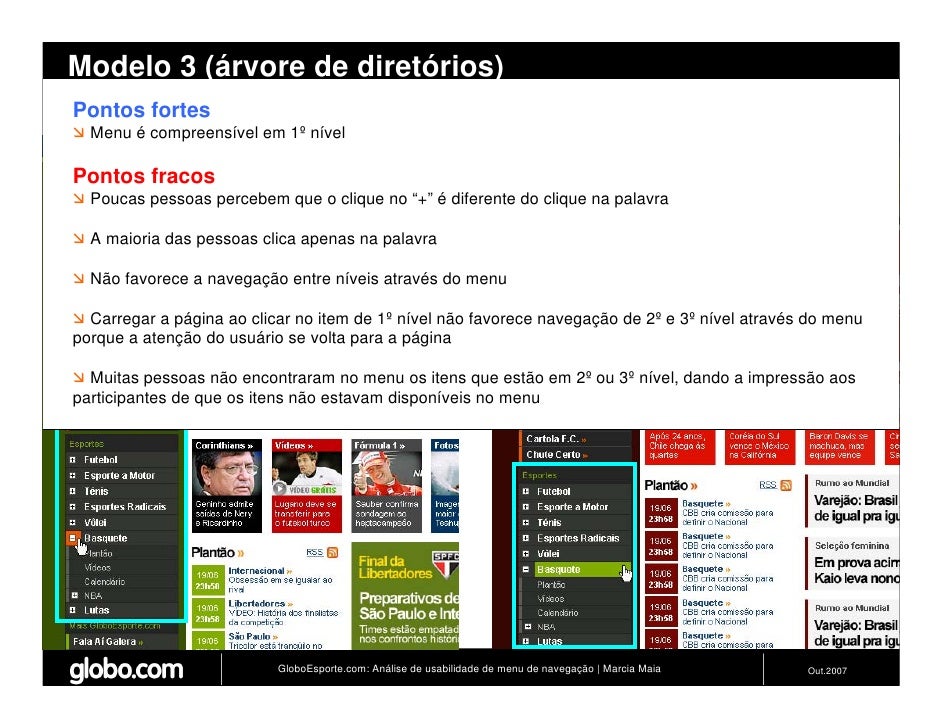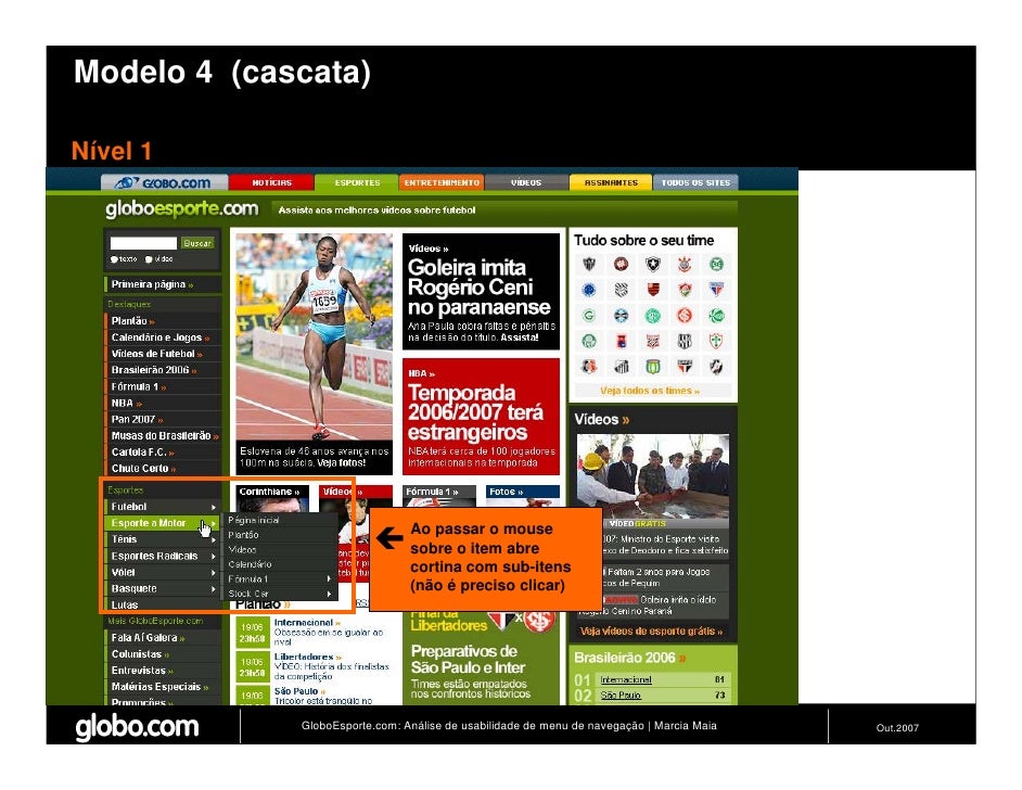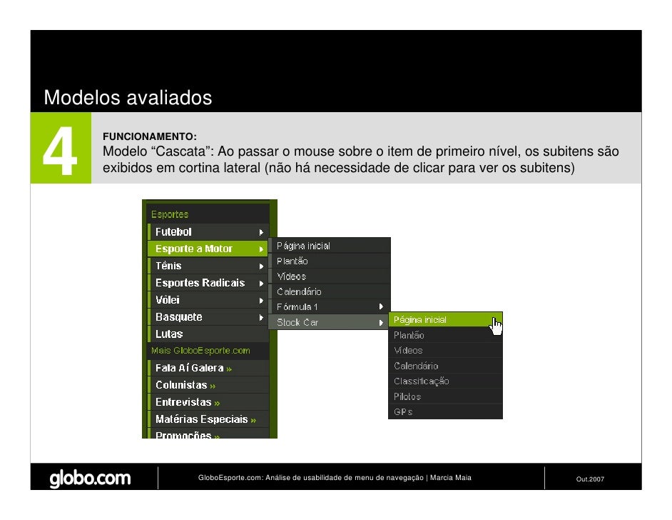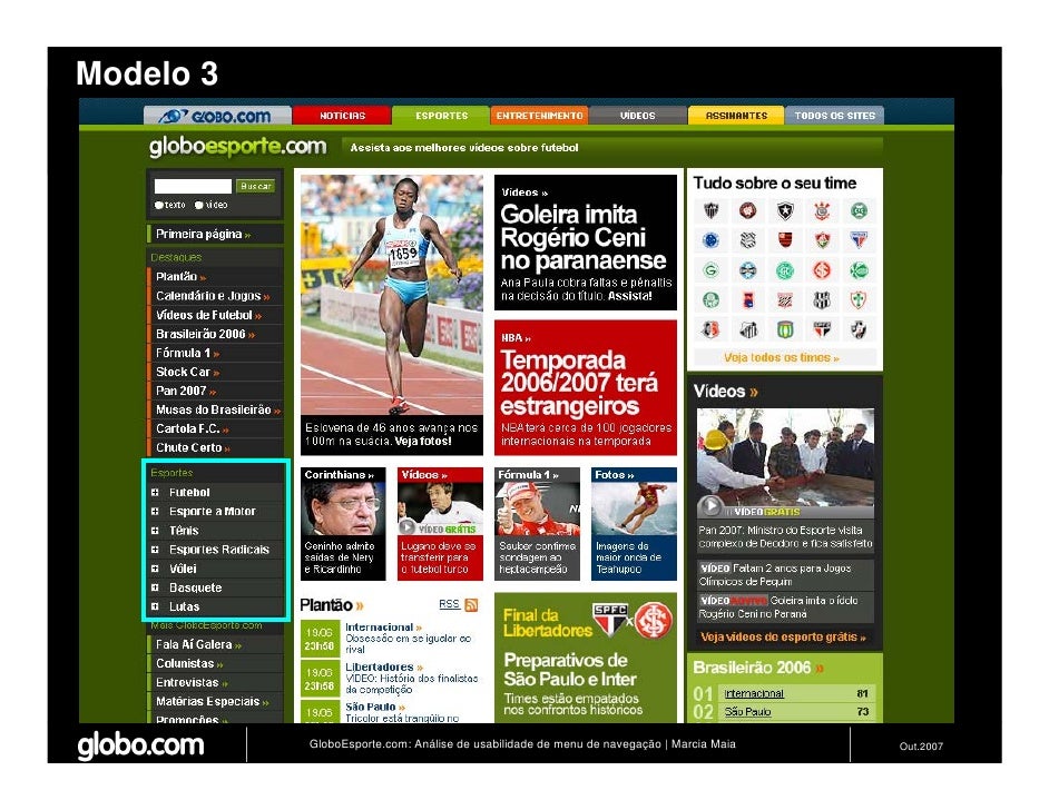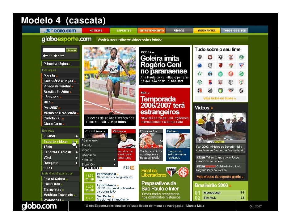 Apresenta resultados de teste de usabilidade de 4 modelos de menus de navegação para o Site do GloboEsporte.com. Trabalho apresentado no EBAI 2007.