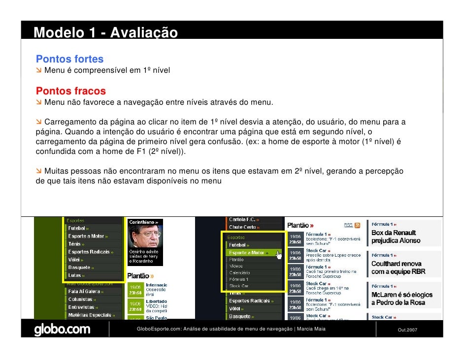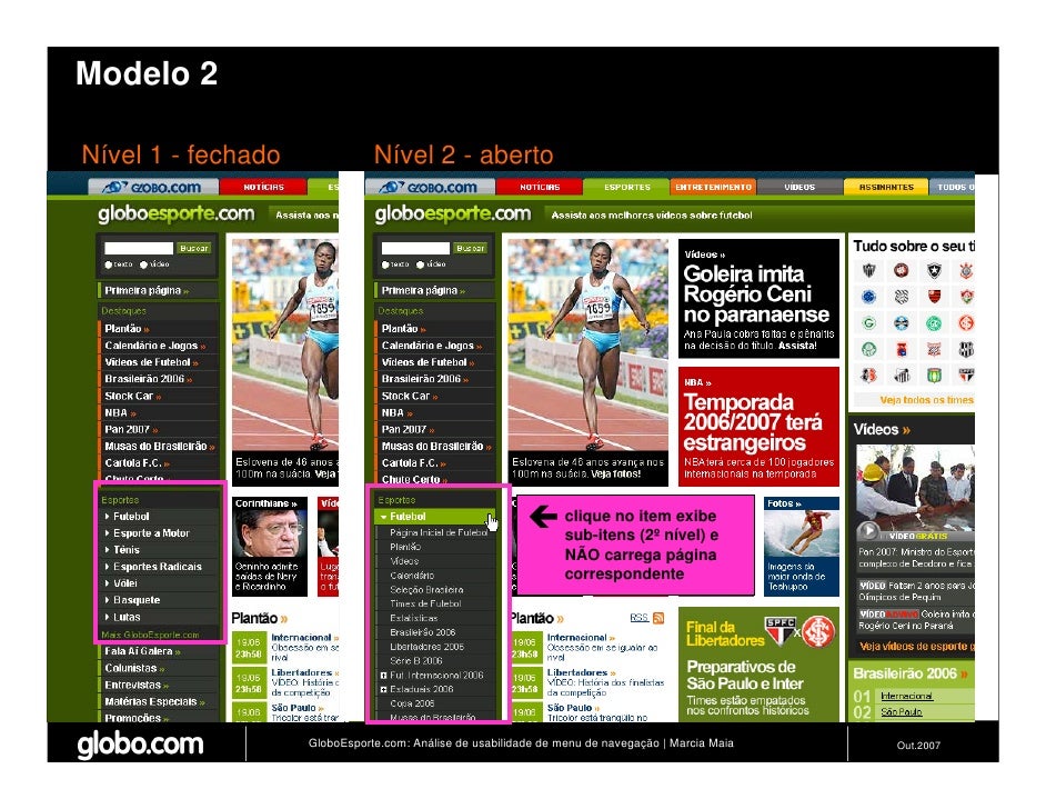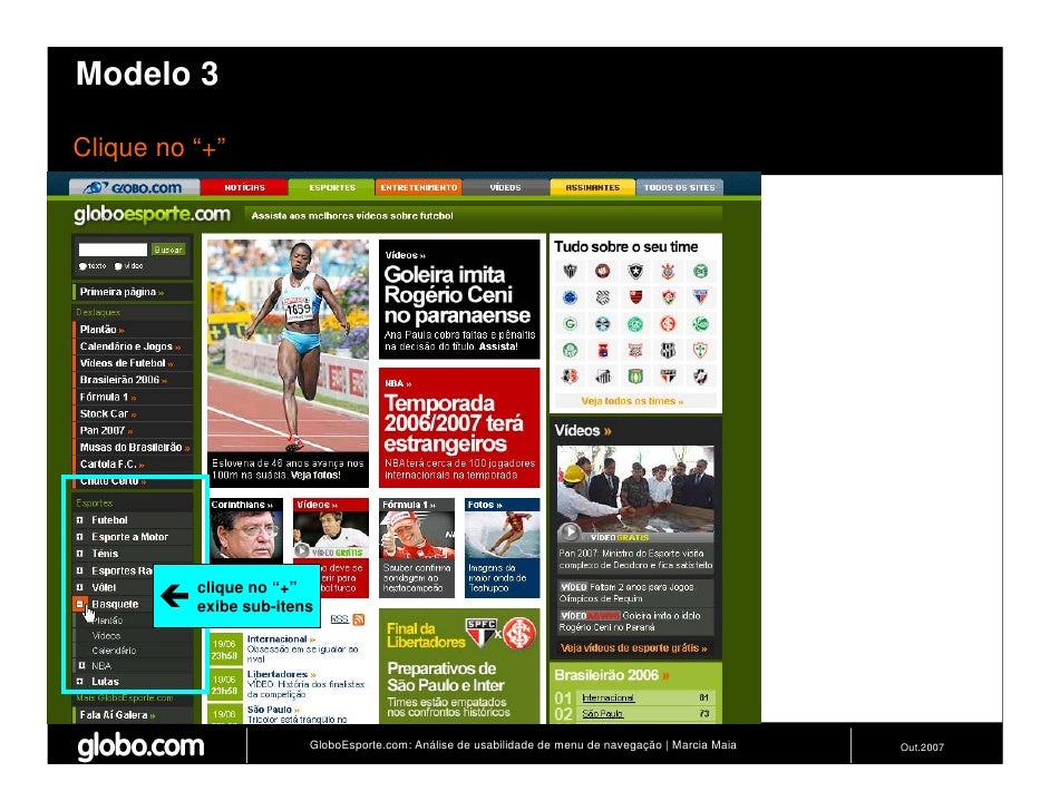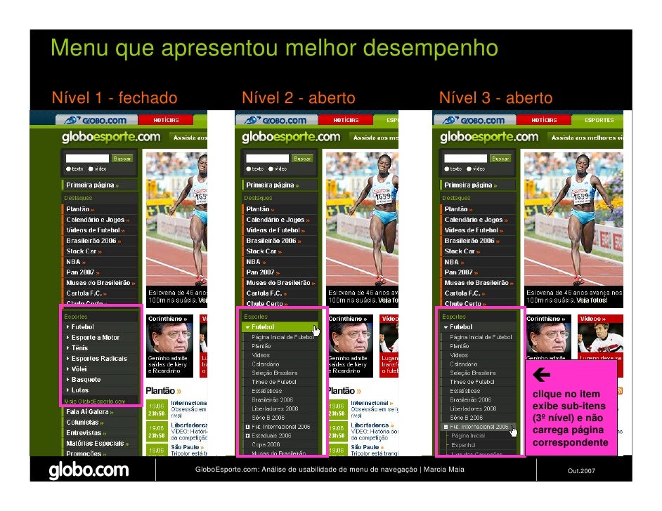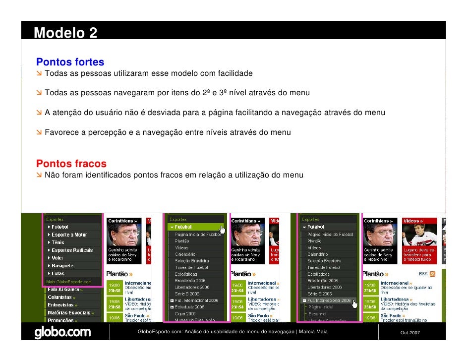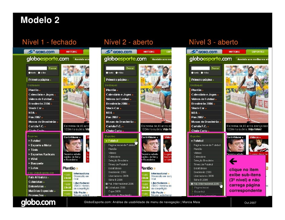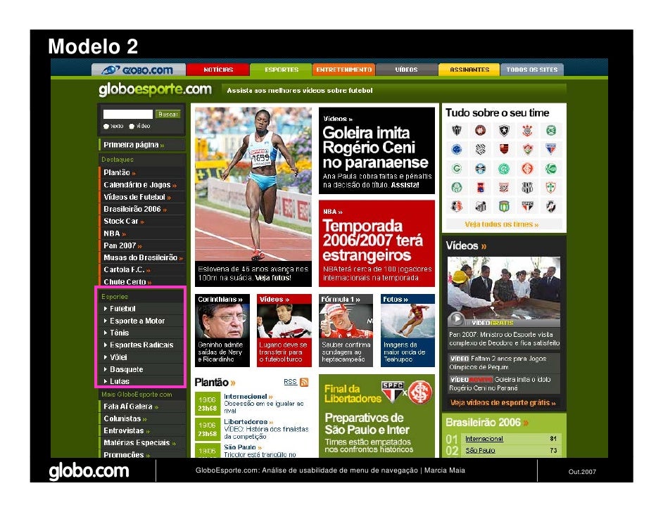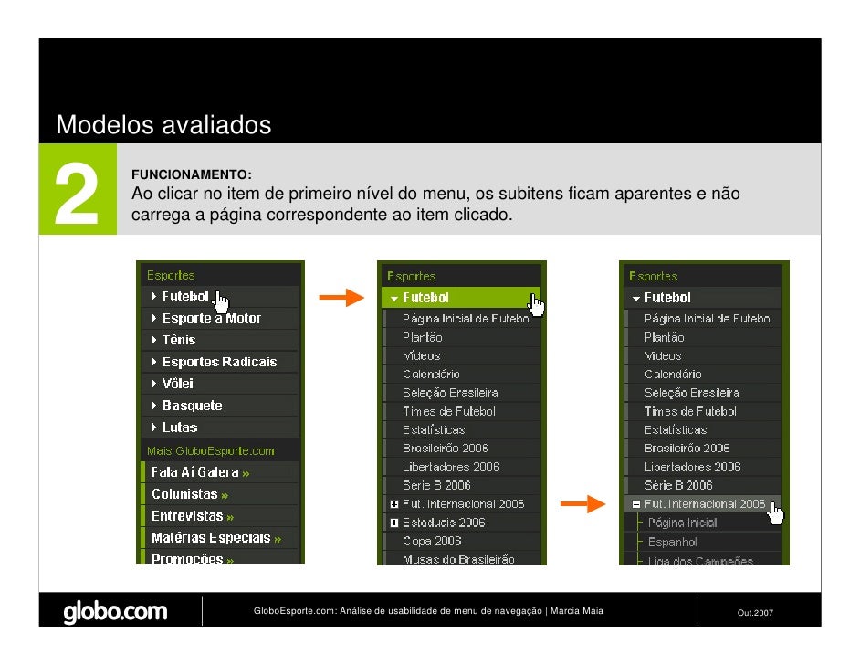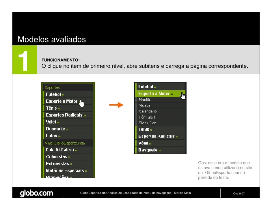 Apresenta resultados de teste de usabilidade de 4 modelos de menus de navegação para o Site do GloboEsporte.com. Trabalho apresentado no EBAI 2007.