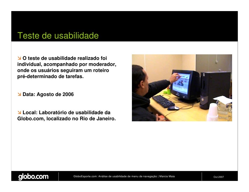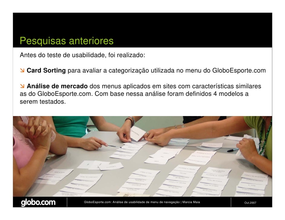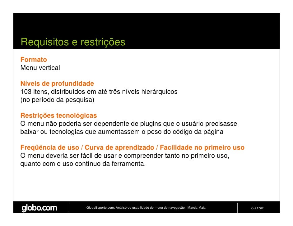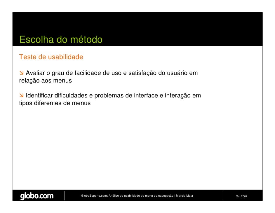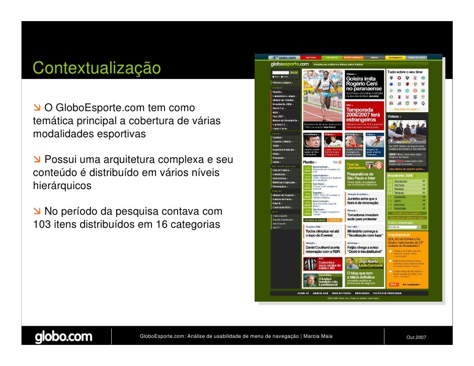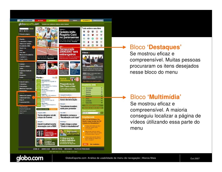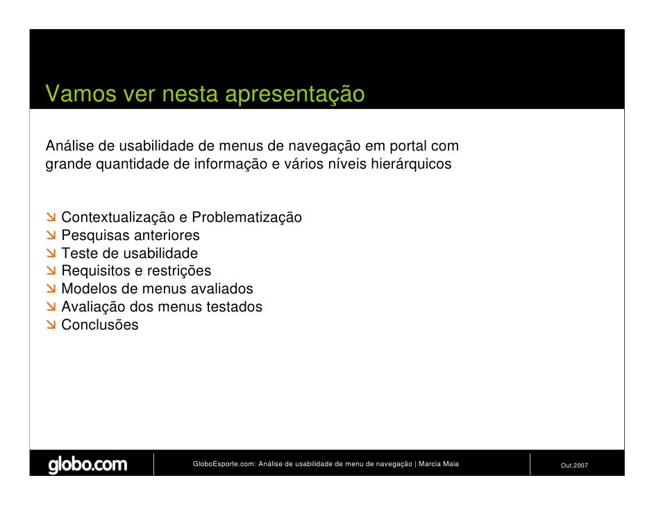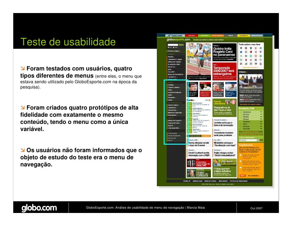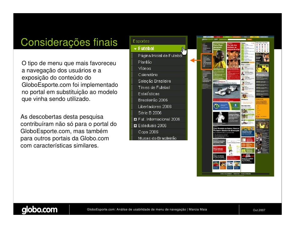 Apresenta resultados de teste de usabilidade de 4 modelos de menus de navegação para o Site do GloboEsporte.com. Trabalho apresentado no EBAI 2007.