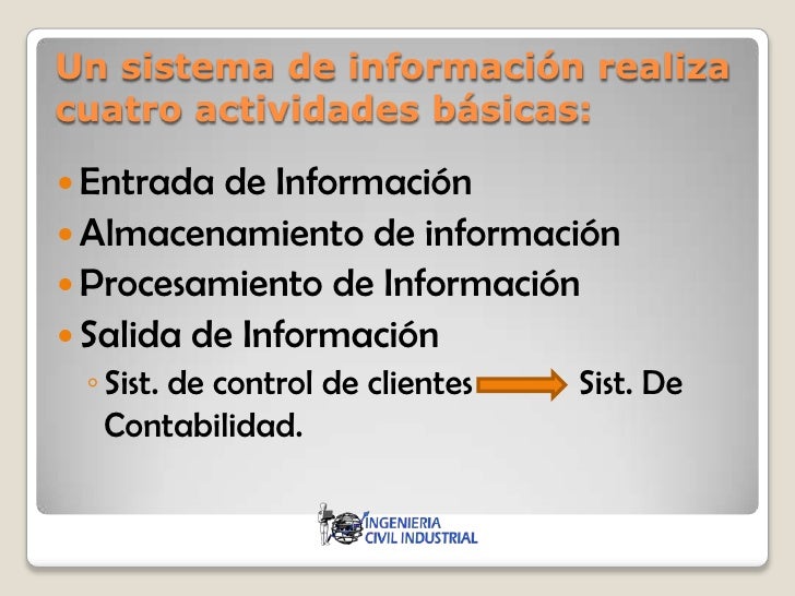 3. 3. Un sistema de información realizacuatro actividades básicas: Entrada de Información Almacenamiento de información Procesamiento de Información Salida de Información ◦ Sist. de control de clientes Sist. De Contabilidad.