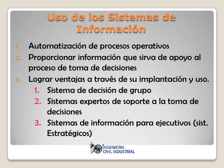 4. 4. Uso de los Sistemas de Información1. Automatización de procesos operativos2. Proporcionar información que sirva de apoyo al proceso de toma de decisiones3. Lograr ventajas a través de su implantación y uso. 1. Sistema de decisión de grupo 2. Sistemas expertos de soporte a la toma de decisiones 3. Sistemas de información para ejecutivos (sist. Estratégicos)
