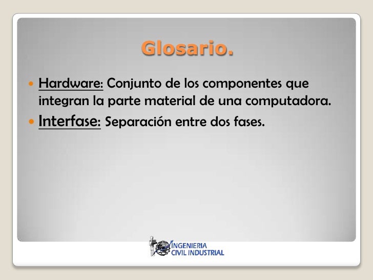 5. 5. Glosario. Hardware: Conjunto de los componentes que integran la parte material de una computadora. Interfase: Separación entre dos fases.