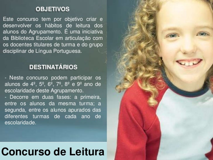 2. 2. OBJETIVOSEste concurso tem por objetivo criar edesenvolver os hábitos de leitura dosalunos do Agrupamento. É uma iniciativada Biblioteca Escolar em articulação comos docentes titulares de turma e do grupodisciplinar de Língua Portuguesa. DESTINATÁRIOS- Neste concurso podem participar osalunos de 4º, 5º, 6º, 7º, 8º e 9º ano deescolaridade deste Agrupamento.- Decorre em duas fases: a primeira,entre os alunos da mesma turma; asegunda, entre os alunos apurados dasdiferentes turmas de cada ano deescolaridade.Concurso de Leitura