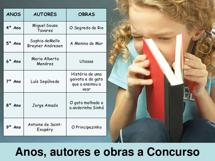 3. 3. ANOS AUTORES OBRAS Miguel Sousa4º Ano O Segredo do Rio Tavares Sophia deMello5º Ano A Menina do Mar Breyner Andresen Maria Alberta6º Ano Ulisses Menéres História de uma gaivota e do gato7º Ano Luís Sepúlveda que a ensinou a voar O gato malhado e8º Ano Jorge Amado a andorinha Sinhá Antoine de Saint-9º Ano O Principezinho Exupéry Anos, autores e obras a Concurso