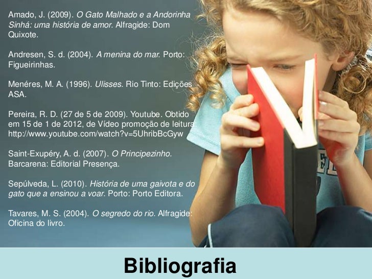 34. 34. Amado, J. (2009). O Gato Malhado e a AndorinhaSinhá: uma história de amor. Alfragide: DomQuixote.Andresen, S. d. (2004). A menina do mar. Porto:Figueirinhas.Menéres, M. A. (1996). Ulisses. Rio Tinto: EdiçõesASA.Pereira, R. D. (27 de 5 de 2009). Youtube. Obtidoem 15 de 1 de 2012, de Vídeo promoção de leitura:http://www.youtube.com/watch?v=5UhribBcGywSaint-Exupéry, A. d. (2007). O Principezinho.Barcarena: Editorial Presença.Sepúlveda, L. (2010). História de uma gaivota e dogato que a ensinou a voar. Porto: Porto Editora.Tavares, M. S. (2004). O segredo do rio. Alfragide:Oficina do livro. Bibliografia