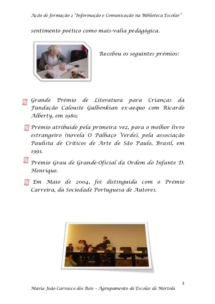 2. 2. Ação de formação 2 “Informação e Comunicação na Biblioteca Escolar”sentimento poético como mais-valia pedagógica. Recebeu os seguintes prémios:Grande Prémio de Literatura para Crianças daFundação Calouste Gulbenkian ex-aequo com RicardoAlberty, em 1980;Prémio atribuído pela primeira vez, para o melhor livroestrangeiro (novela O Palhaço Verde), pela associaçãoPaulista de Críticos de Arte de São Paulo, Brasil, em1991.Prémio Grau de Grande-Oficial da Ordem do Infante D.Henrique.Em Maio de 2004, foi distinguida com o PrémioCarreira, da Sociedade Portuguesa de Autores. 2Maria João Carrasco dos Reis – Agrupamento de Escolas de Mértola