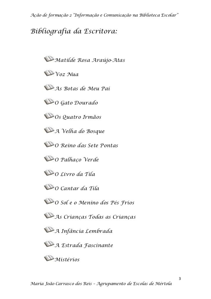 3. 3. Ação de formação 2 “Informação e Comunicação na Biblioteca Escolar”Bibliografia da Escritora: Matilde Rosa Araújo-Atas Voz Nua As Botas de Meu Pai O Gato Dourado Os Quatro Irmãos A Velha do Bosque O Reino das Sete Pontas O Palhaço Verde O Livro da Tila O Cantar da Tila O Sol e o Menino dos Pés Frios As Crianças Todas as Crianças A Infância Lembrada A Estrada Fascinante Mistérios 3Maria João Carrasco dos Reis – Agrupamento de Escolas de Mértola