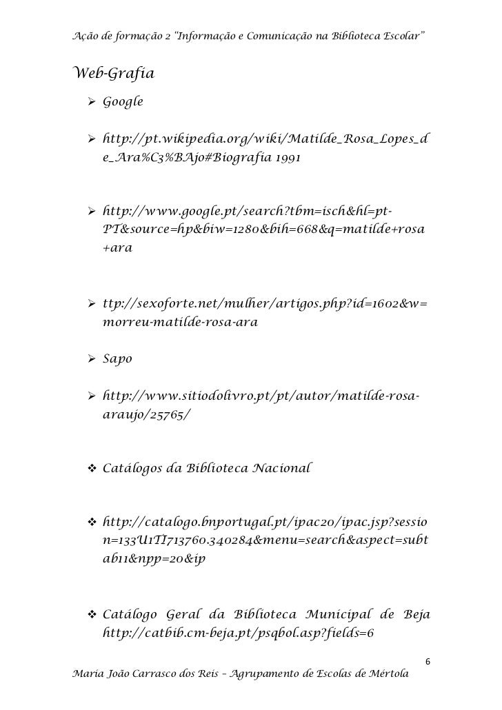 6. 6. Ação de formação 2 “Informação e Comunicação na Biblioteca Escolar”Web-Grafia  Google  http://pt.wikipedia.org/wiki/Matilde_Rosa_Lopes_d e_Ara%C3%BAjo#Biografia 1991  http://www.google.pt/search?tbm=isch&hl=pt- PT&source=hp&biw=1280&bih=668&q=matilde+rosa +ara  ttp://sexoforte.net/mulher/artigos.php?id=1602&w= morreu-matilde-rosa-ara  Sapo  http://www.sitiodolivro.pt/pt/autor/matilde-rosa- araujo/25765/  Catálogos da Biblioteca Nacional  http://catalogo.bnportugal.pt/ipac20/ipac.jsp?sessio n=133U1TI713760.340284&menu=search&aspect=subt ab11&npp=20&ip  Catálogo Geral da Biblioteca Municipal de Beja http://catbib.cm-beja.pt/psqbol.asp?fields=6 6Maria João Carrasco dos Reis – Agrupamento de Escolas de Mértola