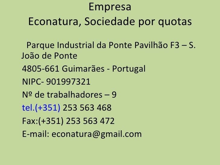 10. 10. Empresa Econatura, Sociedade por quotas <ul><li>Parque Industrial da Ponte Pavilhão F3 – S. João de Ponte </li></ul><ul><li>4805-661 Guimarães - Portugal </li></ul><ul><li>NIPC- 901997321 </li></ul><ul><li>Nº de trabalhadores – 9 </li></ul><ul><li>tel.(+351) 253 563 468 </li></ul><ul><li>Fax:(+351) 253 563 472 </li></ul><ul><li>E-mail: econatura@gmail.com </li></ul>