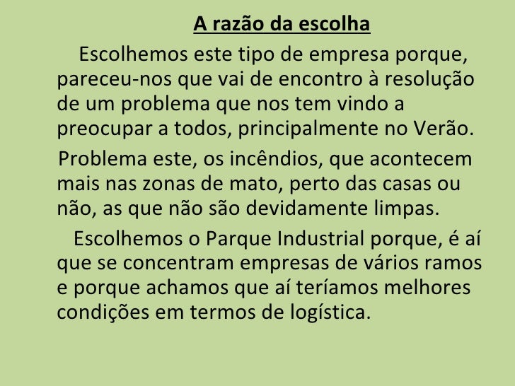11. 11. <ul><li>A razão da escolha </li></ul><ul><li>Escolhemos este tipo de empresa porque, pareceu-nos que vai de encontro à resolução de um problema que nos tem vindo a preocupar a todos, principalmente no Verão. </li></ul><ul><li>Problema este, os incêndios, que acontecem mais nas zonas de mato, perto das casas ou não, as que não são devidamente limpas. </li></ul><ul><li>Escolhemos o Parque Industrial porque, é aí que se concentram empresas de vários ramos e porque achamos que aí teríamos melhores condições em termos de logística. </li></ul>